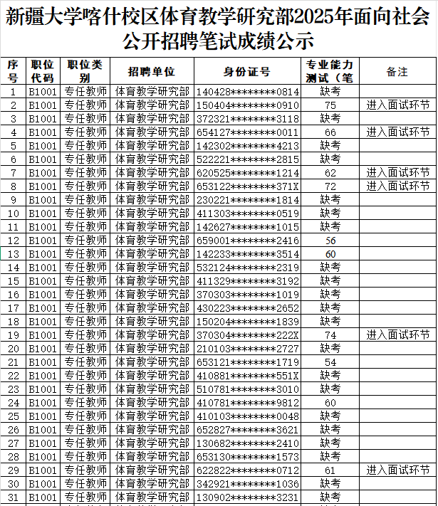 新疆大学喀什校区体育教学研究部2025年面向社会公开招聘笔试成绩公示
